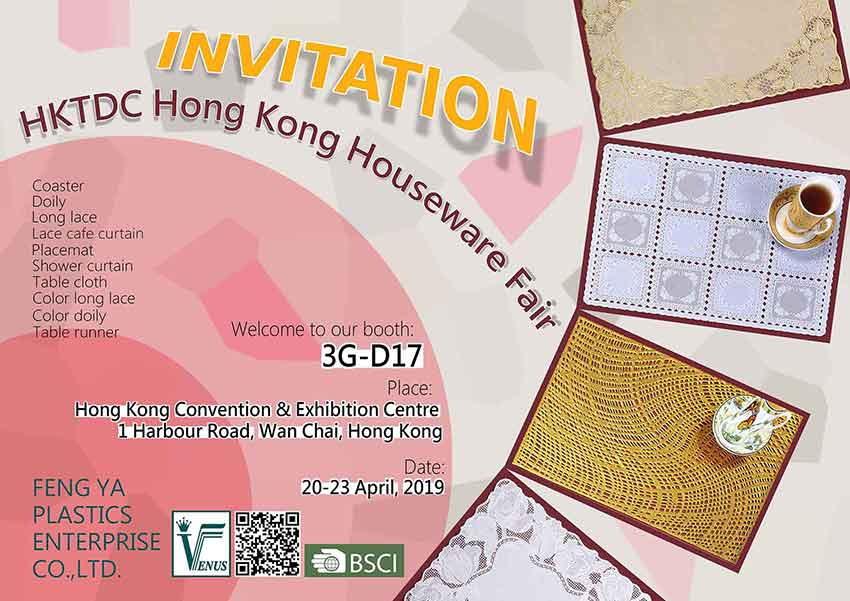 News Official fair name : HKTDC Hong Kong Houseware Fair 2019 Fair dates : April 20 - 23, 2019 Opening hours : April 20 - 22, 2019 9:30AM - 6:30PM ; April 23, 2019 9:30AM - 5:00PM Venue : Hong Kong Convention and Exhibition Center Booth no. : 3G-D17 New Products EVA Doily FYA-9 Vinyl Rigid Lace Placemat FY-116 Vinyl Rigid Lace Placemat FY-036 Vinyl Long Lace TIM-511 Vinyl Long Lace TIM-511 VINYL LONG LACE WRF-022 (137/150cm) VINYL LONG LACE WRF-022 (137/150cm) VINYL LONG LACE FY-102 (137cm) VINYL LONG LACE FY-102 (137cm) VINYL LONG LACE FY-102 Back